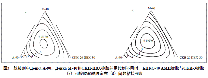 三種橡膠并用,實(shí)際上并不會(huì)改變粘接強(qiáng)度,而是仍然保持其相當(dāng)高的水平。在考慮工藝指標(biāo)(粘合膠料的溶解度,膠粘劑干燥的時(shí)間)和技術(shù)指標(biāo)(耐熱性、粘附指標(biāo))時(shí),將三種橡膠(Денка М-40+ДенкаА-90+CKH-26-ПВХ-30)并用是的方案。借助于Matlab和Table Curve 3D的程序,確定了膠粘劑中幾種橡膠的比例。根據(jù)標(biāo)準(zhǔn)試樣中БНКС-40 AMH橡膠與擦膠簾布以及СКИ-3橡膠之間粘接強(qiáng)度的分析結(jié)果,確定了膠粘劑中幾種橡膠的并用比例。結(jié)果證明,所研究的橡膠彼此間表現(xiàn)出明顯的協(xié)同效應(yīng)。以橡膠并用為主的膠粘劑在平均質(zhì)量和定量比的前提下,幾種橡膠并用的膠粘劑的粘附活性(見圖3)。