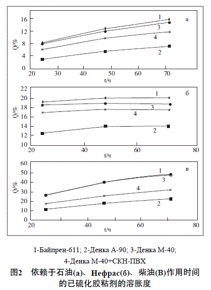 使用在石油介質(zhì)中工作的膠布制品(由氯丁膠粘劑把橡膠件和膠布件拼裝起來)時(shí)發(fā)現(xiàn),拼接處是薄弱的部位。這是因?yàn)槁榷∠鹉z在耐油和耐汽油性方面略遜于丁腈橡膠。為了評(píng)估膠粘劑的耐腐蝕性,研究了石油、Нефрас和Л-02-04柴油對(duì)所研究的粘合膠料硫化膠在72 h內(nèi)溫度為20 ℃時(shí)的溶脹度的影響(見圖2)。