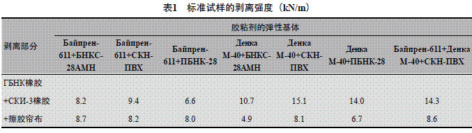 為了研究試驗(yàn)用膠粘劑的粘合能力,制備了模仿膠布制品中粘合行為的試樣。測定了ГБНК橡膠與以СКН-3膠料擦膠的芳族聚酰胺簾布之間的粘接強(qiáng)度,以及ГБНК橡膠與丁腈橡膠СКН-3橡膠之間的粘接強(qiáng)度(表1)。