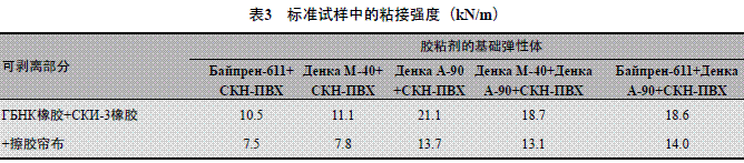 使用以幾種橡膠并用的試驗(yàn)用膠粘劑,對(duì)其標(biāo)準(zhǔn)試樣進(jìn)行試驗(yàn)。結(jié)果表明,使用含有高結(jié)晶橡膠的CKH-26-ПВХ-30膠料,將導(dǎo)致不同橡膠間的粘接強(qiáng)度大大提高(見表3)。